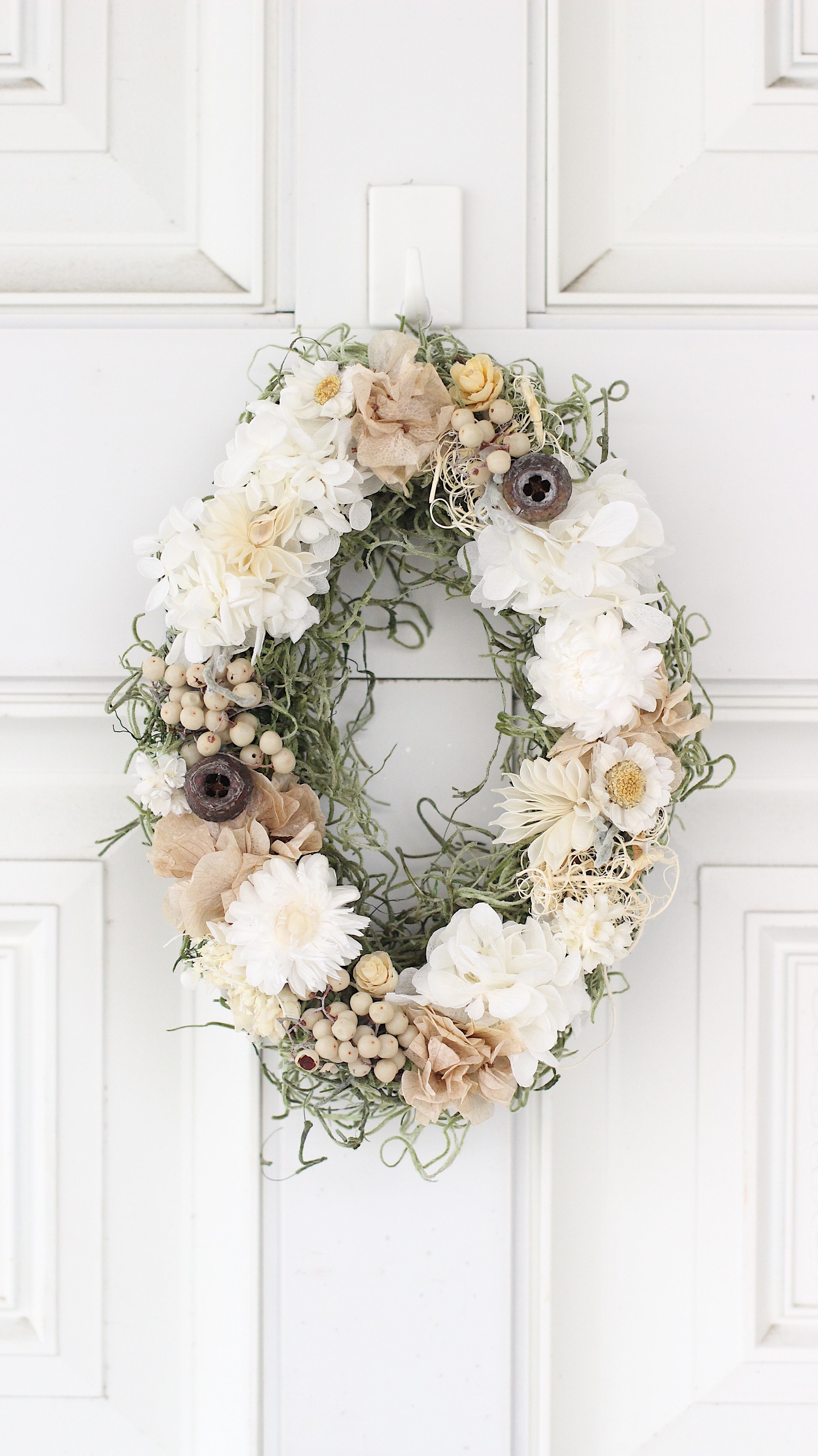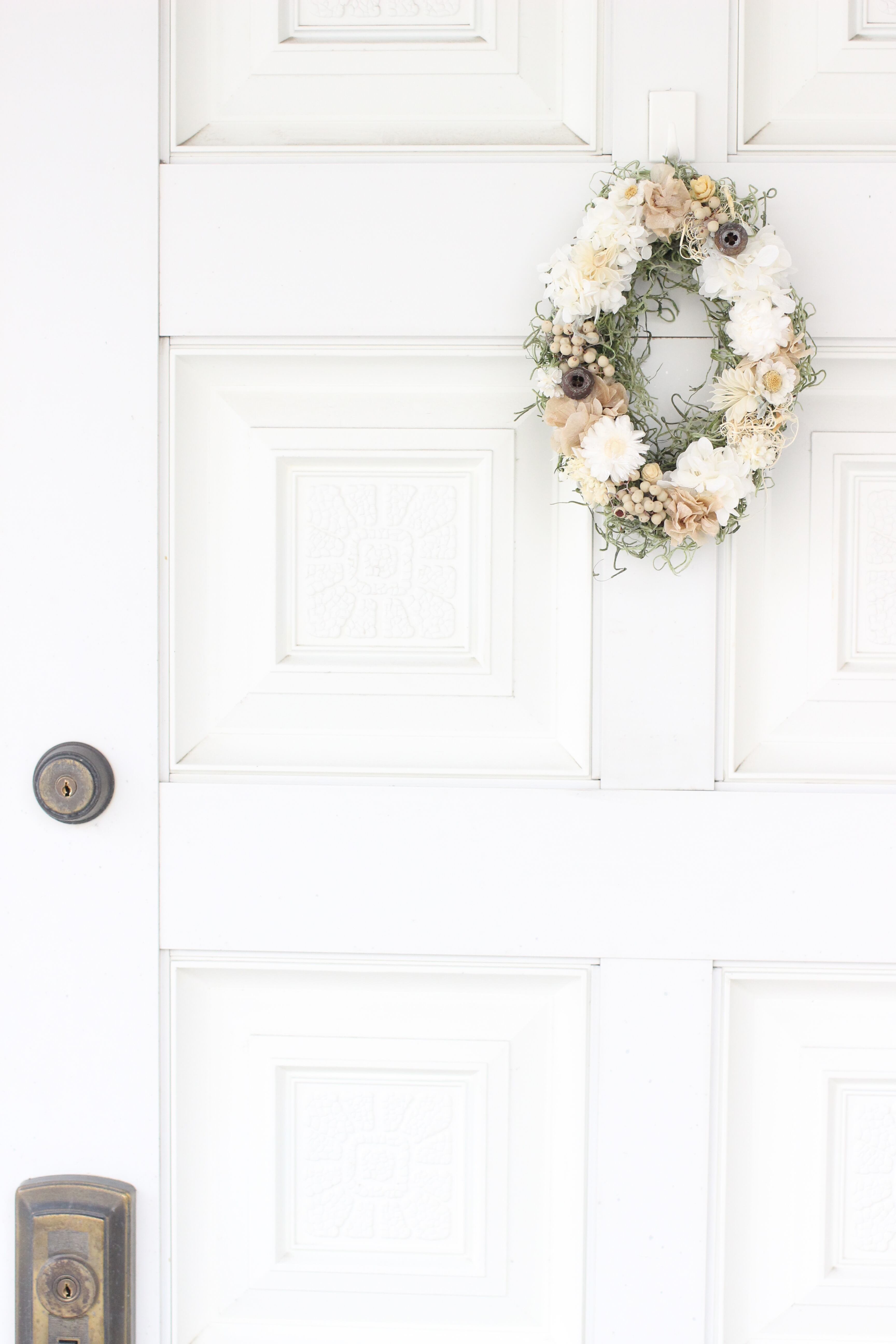 当店のナチュラルリースは一つ一つ全て手作業でおつくりしております。使用しているプリザーブドフラワーやドライフラワーは大変繊細です。プリザーブドフラワーは生花に特殊加工を施しており半年~約2年保てるように加工されているお花です。花びらが欠けている箇所や変形している箇所、また、お色の濃淡等がある場合がございます。自然の植物の為予めご了承ください。なお、ご使用時の破損による返品交換の補償は出来かねます。万が一ご使用中に小さな植物が取れてしまった場合は接着剤等でメンテナンスをしていただけると幸いです。リースの土台部分で使用しているスパニッシュモスはグルーガンでしっかり土台に付けておりますが、スパニッシュモスの仕様上ほつれてしまうことがございます。B品ではございませんので予めご了承ください。